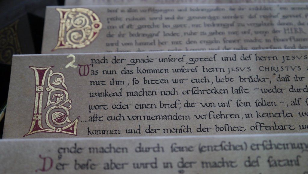 Im September 2021 startete die erste Ausstellung in der Stadtkirche zu Wittenberg, eine weitere folgte 2022 in der St. Petri Kirche in Seehausen (Altmark), 2023 in der St. Nicolai Kirche Lüneburg, 2024 in St. Lamberti Oldenburg. Ausgestellt wird das gesamte Neue Testament, welches in einem Zeitraum von 5 Jahren kalligrafiert wurde. Jedes Buch des Neuen Testamentes wurde einzeln in einer anderen historischen Schriftart geschrieben und einzeln als Leporello oder als Buch gebunden. Es handelt sich um eine Wanderausstellung und kann (komplett mit dem gesamten Ausstellungsmaterial) von interessierten Kirchengemeinden ausgeliehen werden.