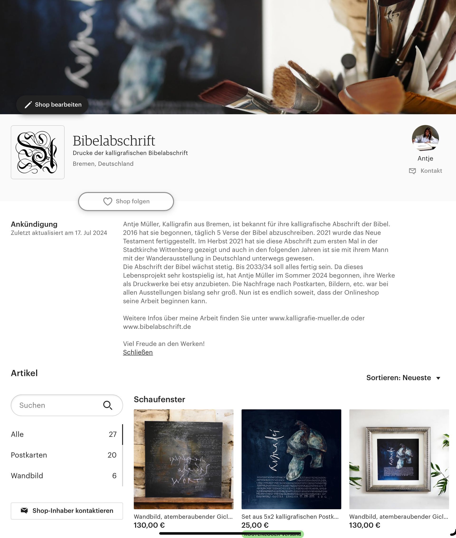 Aufgrund der hohen Nachfrage nach meinen Werken, habe ich einen Etsy-Shop "Bibelabschrift" eingerichtet. Schauen Sie doch einmal vorbei.